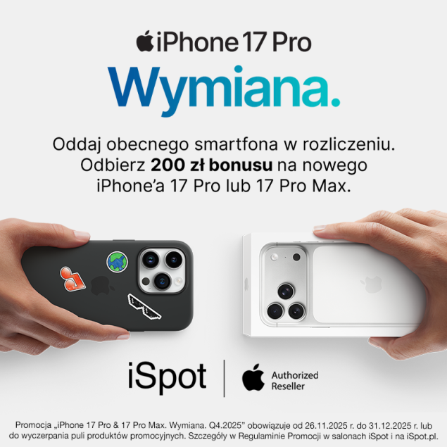 Oddaj obecnego iPhone'a w rozliczeniu. Otrzymaj bonus 200 zł od iSpot na nowego iPhone'a 17 Pro & Pro Max.